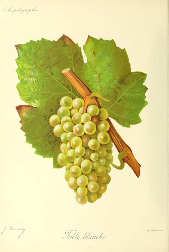 The first recorded mentioning of Folle blanche was in 1696 when the grape was documented as one of the varieties growing in the Charente-Maritime department. Here the grape has had a long history being used in the production of Cognac and Armagnac. The name Folle is a feminine derivative of the French word fou which means “mad” with ampelographers speculating that this could be a reference to the grapevine’s tendency to being highly productive and grow vigorously where ever it is planted. Several of Folle blanche’s synonyms also seems to make similar allusions such as Gros Plant (big vine) which was first used for the grape in 1732 in the Loire-Atlantique department and Enrageat (from the French enragé) that has been a common synonym for Folle blanche in Southwest France since at least 1736.