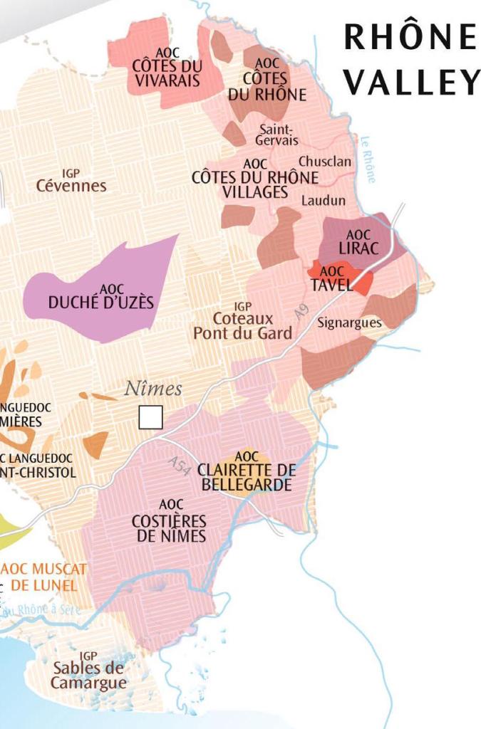 The region is planted on both sides of the Rhône river as it flows to the Mediterranean Sea, on hillsides and plateaus at various altitudes. Rhône Valley vineyards found in Occitanie are located in the Gard department on the right banks of the Ardèche and Rhône rivers.